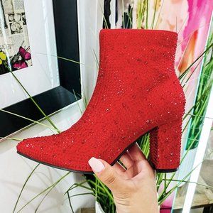 NEW🔥 Red Rhinestone Crystal Block High Heel Ankle Boots Booties Pointed Toe Zip