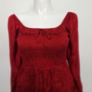 "NEW" Red Romantic Coquette Jacquard Floral Ruffle Smocked Midi Dress Size M