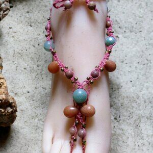 Unique pair of handmade barefoot sandals made with red and green aventurine gemstone beads. These sandals are made with red dyed hemp and have braided toe loops and ankle ties for added durability. They have 8" long back ties that can be knotted behind the ankle. One size fits most teens and adults.