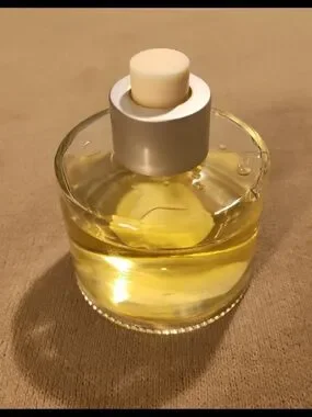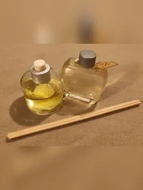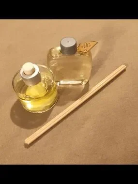 Glass and plastic diffuser bottles with light yellow diffuser oil. Includes natural wooden reeds. Simple, modern scent display. Great for adding ambiance.