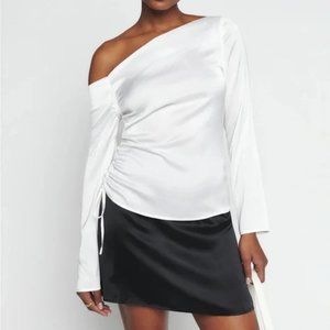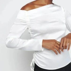 The Allira is an off the shoulder, long sleeve top with an asymmetrical neckline, adjustable side tie, and ruching details