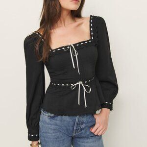 NEW Reformation Haisley Top Blouse Sz2 Black Long Sleeves Lace Cotton Bow