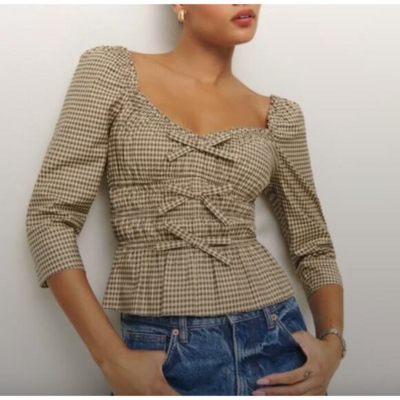 NEW Reformation Lauryn Cotton Bow Blouse Top - Blondie Check French