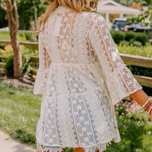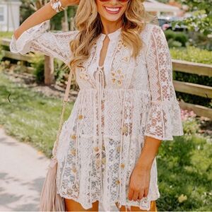 Flirt your way through summer in this adorable Resort Lace Cover-up top featuring ultra lightweight semi-sheer lace material with additional shell embellished detailing, a v-cut neckline with a tie closure, long loose sleeves, a cinched closure, and a relaxed silhouette that falls into a straight hemline! Perfect statement piece for spring and summer - wear as a top with a pair of jeans or shorts, or as a swimsuit cover-up, or use as a statement jacket over a tank dress. Exude effortless style with this gorgeous beach cover-up that doubles as a boho dress. Great, versatile piece.