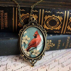 This handmade pendant necklace has a vintage-inspired image of a Cardinal with an antiqued-bronze finish. The image is reversed decoupage under a large 30 x 40mm oval glass cabochon. This necklace can be worn throughout the year, with particular appeal during the spring.
