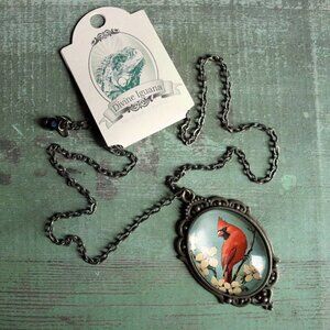 NEW - Retro Cardinal Ornate Pendant Necklace - Oval - Glass Cabochon - Bird