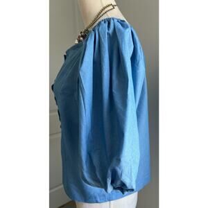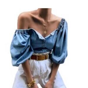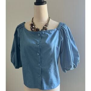 NEW Retro Off Shoulder Chambray Puff Sleeve Button Up Loose Light Top Blouse 2XL