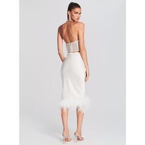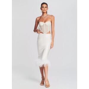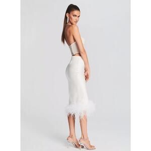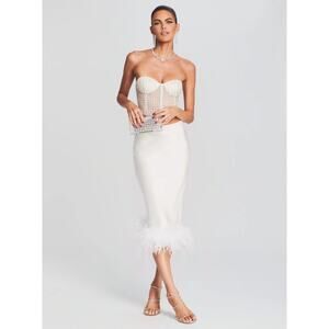 NEW Retrofete Paula White Satin Ivory Genuine Ostrich Feather Trim Midi Skirt