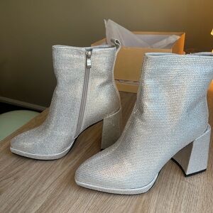 NEW Never worn silver rhinestone heeled ankle boots.