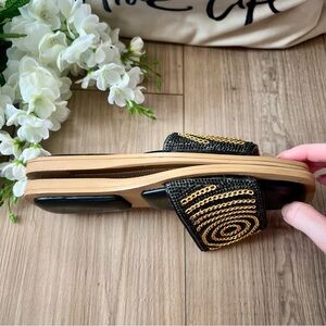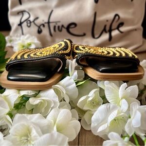 Step out in style with these elegant black and gold slide sandals. Perfect for any occasion, these shoes offer both comfort and sophistication.
