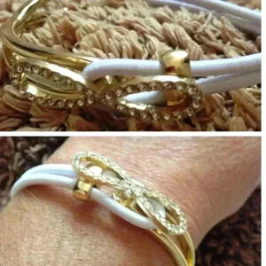 Rhinestone embedded infinity with golden and white bracelet. Fits 6" - 8.5" wrists.