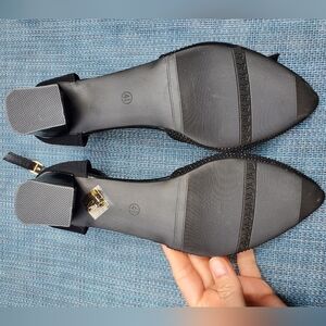 NEW! Rhinestone Minimalist Black Dress Shoe with Low Heel, one strap with buckle
