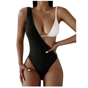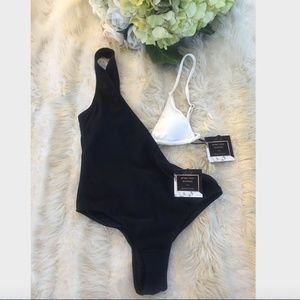 includes; 3 pieces; white ribbed top, white ribbed bottom, and black asymmetric one piece