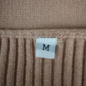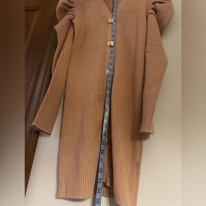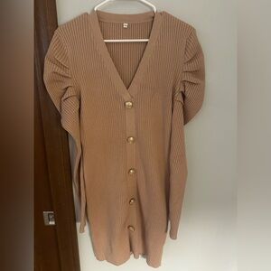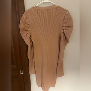 Stylish beige ribbed dress with faux button-up front and puff sleeves. Brand new, never worn! Size medium and 33” long from the shoulder.