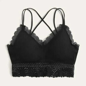 This bralette features black ribbed fabric with banded floral lace trim. Stretchy fabric and straps. Fully lined with removable cups. Strappy criss-cross design in back. No closures; just slips on.
