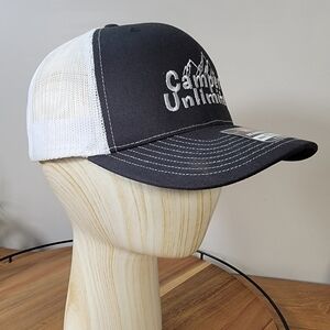 Black and White Men's 'Campers Unlimited" Snap Back Trucker Hat. White Mesh back with adjusted snap closures.