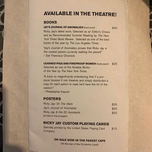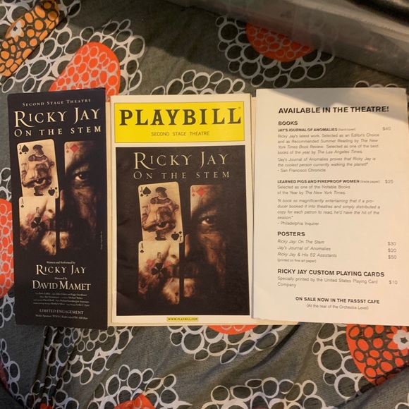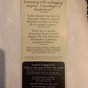 Offered here is a collection of ephemera from a Ricky Jay magic show in New York City. Sadly, this great magician passed away. He was amazing in person. The ephemera here is the Playbill, an insert of the items for sale during intermission which included the pricing and a flyer announcing the show. These items can be framed easily and have become highly collectible in the world of magic.