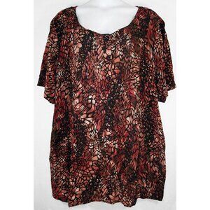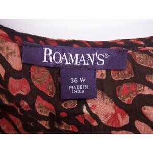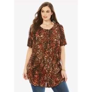 NWOT Roaman's Angelina Tunic Top, size 36W. Its Rust, Brown and Black in color, animal print throughout, button down style, scoop neck, short sleeves, pintucks in front and back, rounded tunic length hem, fabric is lightweight 100% Rayon crinkle crepe, machine washable. Comes from a smoke free home.