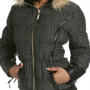 This jacket is new, never worn.Fur Hood FEATHER ,DOWN , LEATHER, FUR COAT WINTER L- Jacket has RW insignia print throughout the outer fabric, real leather details and zip front close