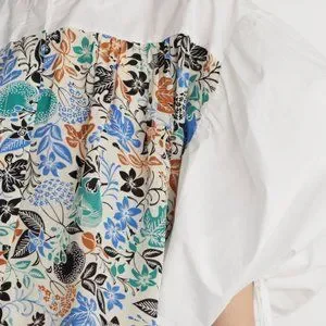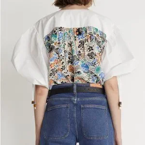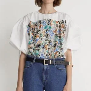 New beautiful voluminous blouse in an original moroccan garden print combined with a crisp white cotton. It has puff sleeves, hidden buttons in front and drawstring endings. Wear with boyfriend jeans.