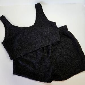 Roma Barely Awake Fuzzy Lounge Set. Solid black teddy bear material. Pull-on high waisted shorts and crop tank.