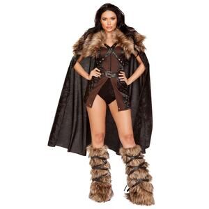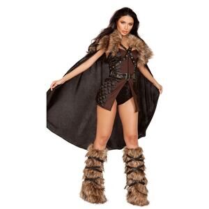 Defend and protect at all costs! Be battle-ready in this Fierce Northern Warrior costume featuring a strapless front slit dress with a zipper closure and quilted sides, an adjustable waist belt, a criss-cross tie strap with stud accents, and a flowing cape with faux fur shoulders. (Faux fur boot covers and shorts not included.)
