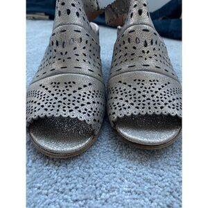 Ladies, you will love the peep toe sandal as it drapes your foot in soft metallic laser cut nubuck leather and provides wonderful flattering coverage. Wear these platino, almost nude metallic sandals with your early spring outfits and right through to fall.