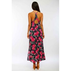 This rose print dress is a maxi style. It has spaghetti straps and a racer back style with a keyhole. It is ankle length with slits on the sides that hit mid thigh.