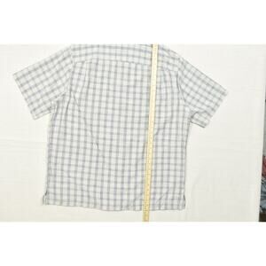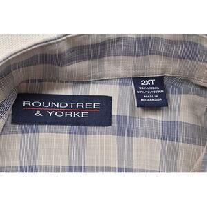 This listing is for a Roundtree & Yorke men's button-down shirt in a size 2XT. This casual collared shirt features a stylish plaid pattern in shades of white, gray, and blue. Made from a comfortable and breathable blend of 56% modal and 44% polyester, this short-sleeve shirt is perfect for everyday wear. The shirt is a regular fit with a button-down closure and a square tail hem. It's in excellent pre-owned condition with no visible signs of stains, rips, or tears. Please refer to the images for specific measurements to ensure a proper fit. The tag indicates it was made in Nicaragua. This is a great addition to any casual wardrobe.