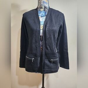 New with tags, Roz & Ali lightweight black rib knit blazer or cardigan with zip side pockets . If you run hot but need a blazer, this is for you! It's lightweight but still looks refined and dressed up. Elevate your wardrobe with this sleek black jacket from Roz & Ali. Perfect for any occasion, this stylish piece offers both comfort and elegance. Size Medium Petite, laid flat measurements: chest 18", length 23".