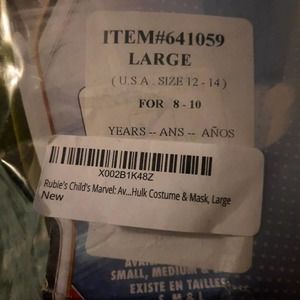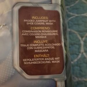 Brand new in package, face mask still sealed shut. Child Large US 12-14. For 8-10 year Olds. Includes padded (muscle chest, thorax muscle) jumpsuit, attached shoe covers and mask.