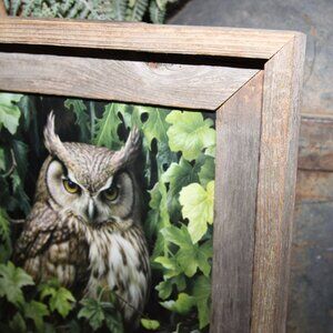 wall decor, picture, framed, owl, woodland, rustic, farmhouse, foliage, cabin, woods, dark, moody