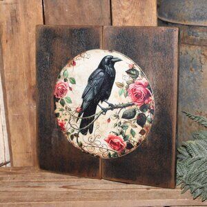 NEW one of a kind, custom made 11" tall x 10.75" wide black Raven, crow, black bird and roses wall decor plaque. Rustic reclaimed planked wood plaque with distressed and aged burnt barrel brown finish and colorful 8" round metal sign at center. Will hang or prop! Unique, one of a kind piece for wall or table top decor!