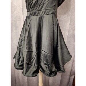 The NEW Ryu One Shoulder Whimsigoth Fairy Grunge Cocktail Dress in size L is a festive formal and elegant option for various occasions, including weddings, parties, and formal events. Made from satin fabric and featuring a puff sleeve and ruffle accents, this A-line dress is perfect for holiday gatherings or fairy-themed celebrations. The knee-length dress has a high waist and is lined for added comfort, making it a stylish and practical choice for any season. Designed in a striking black color, this dress exudes a sophisticated yet whimsical charm, suitable for a wide range of themes and styles. PTP 17.5 in Length 27.5 in.