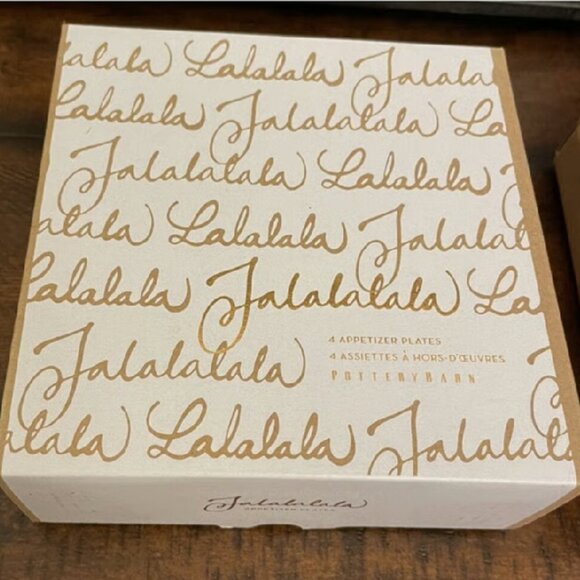 For Sale: One (1) Brand New & Unused Set/4 Brand New & Unused — Bought from PB directly and still in their original box — Pottery Barn Fa La La Gold + White Holiday Appetizer Plates — a retired design, measuring 5.75" square!