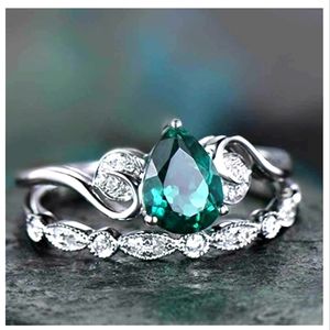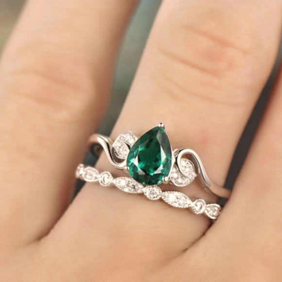PEAR SHAPED SIMULATED EMERALD STONE WITH CUBIC ZIRCONIA STONE ACCENTS RING & CUBIC ZIRCONIA STONES ON BAND
