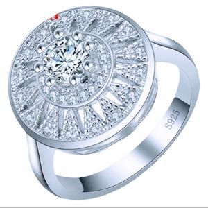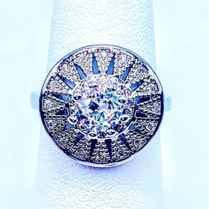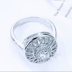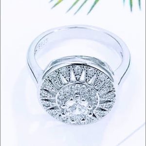 This absolutely gorgeous new boutique ring is a sparkler! It features a large round CZ center stone surrounded by triangular pave CZ stones set within a brightly polished stamped S925 sterling silver and rhodium plated for a lifetime of tarnish free wear. Size 7. Brand new boutique item arrives in gift 💝 box!