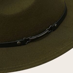 Add some mystery to your ensemble with this hunter green panama style hat. Vegan black leather belted band is removable.