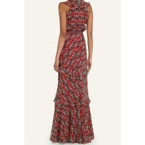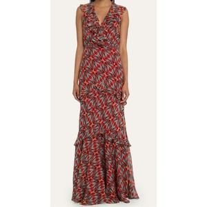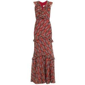 Fabric Type Silk. Closure Type Button. Features Flounce hem. Maxi length. V neckline with ruffle detail. Dry Clean Only. Origin Imported