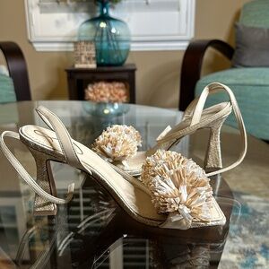 NWOB! Pompom-inspired embellishments detail the toe strap of a square-toe sandal set on a tapered heel.
