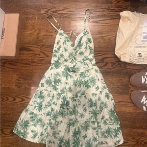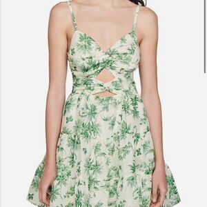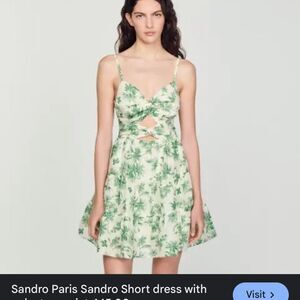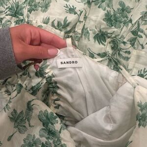 This Sandro mini dress features a vibrant green and white floral print, perfect for a night out or cocktail event. The sleeveless design with a sweetheart neckline and spaghetti straps offers a chic and breezy style. Crafted from lightweight fabric, it ensures a flattering and comfortable fit.