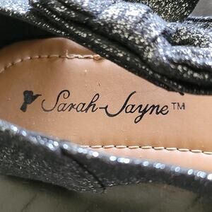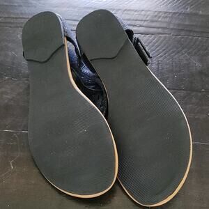 SARAH JAYNE vegan flat sandals with bow on sides. Easy closure. Metallic black & silver material look. Material is soft. Cut outs in material. Lightweight.