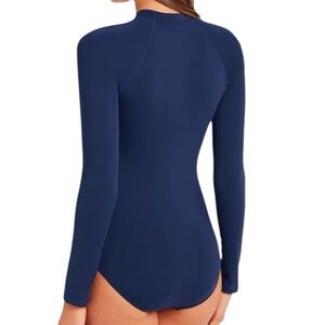 Stylish navy swimsuit with long sleeves. Features a front zipper for easy wear. Perfect for beach or pool days.