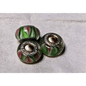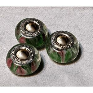 NEW SET OF 3 PANDORA MURANO BEADS TRANSLUCENT GREEN W/PINK & WHITE MARKINGS