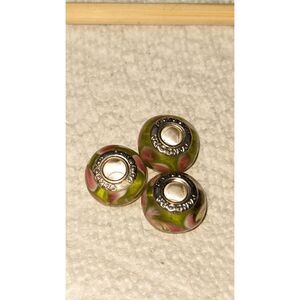 NEW SET OF 3 PANDORA MURANO BEADS TRANSLUCENT LT GREEN W/PINK & WHITE SWIRLS - BEAUTIFUL!