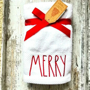 NEW - SET of 2 - Rae Dunn - MERRY - White with red embroider Hand Towels by Magenta
