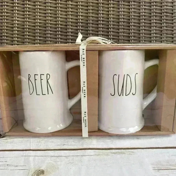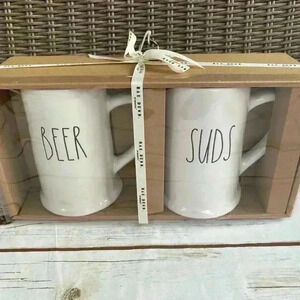 NEW Super FUN set of 2 - BEER & SUDS - Rae Dunn WHITE glazed ceramic Beer Steins/Mugs in a gift box
