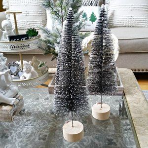 New and the ONLY set I have at this time. Tall bottle brush trees measures 19" x 5" x 5". Slightly flocked as shown. Perfect all winter through. Pairs perfectly with many decors. Priced according to Posh's 20% fee. Smoke free ty for poking in my closet xx