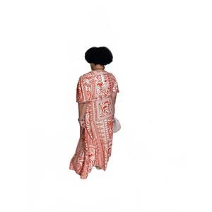 Elevate your summer wardrobe with the Abstract Print Brenlyn Dress by SHE + SKY, a stunning piece in vibrant orange and cream for boho chic appeal. Featuring short puff sleeves, an elastic waist, and a flattering v-neckline, this shift silhouette midi dress showcases a front slit for added allure. Composition: 100% Polyester. Closure: Pull-on style. Designed for the plus-size figure, the dress is perfect for holiday parties and is accented by pockets for functionality. Model is 5'8" and wearing size 2X.