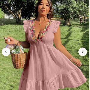 NEW SHEIN Plus 2XL V-Neck Embroidered Trim Textured Holiday Summer Dress Plunge